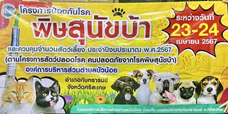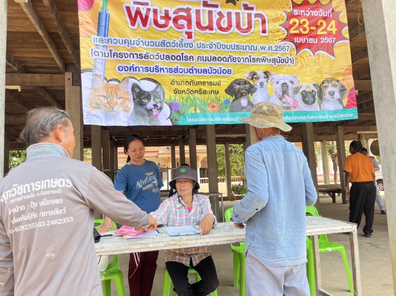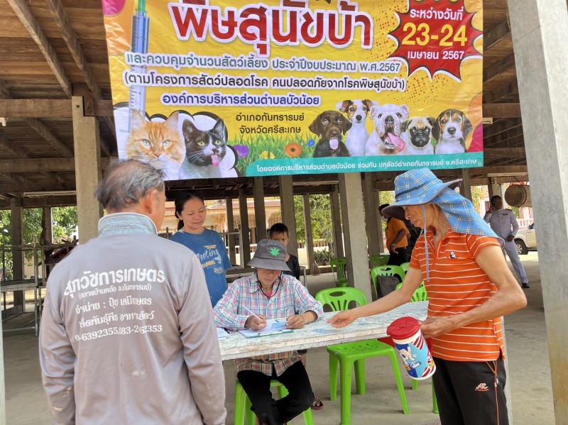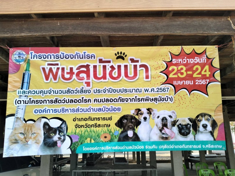 วันที่ 24 เมษายน 2567 อบต.บัวน้อย ดำเนินโครงการป้องกันโรคพิษสุนัขบ้า และควบคุมจำนวนสัตว์เลี้ยง ประจำปีงบประมาณ พ.ศ.2567 (ตามโครงการสัตว์ปลอดโรค คนปลอดภัยจากโรคพิษสุนัขบ้า) **ออกให้บริการฉีดวัคซีนร่วมกับ ปศุสัตว์อำเภอกันทรารมย์ ในพื้นที่หมู่่ 1 - หมู่ 11