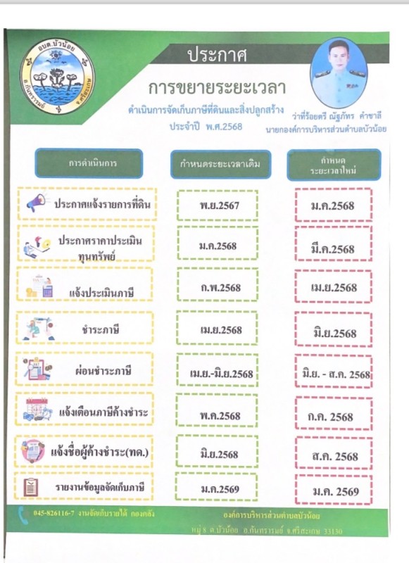 ประกาศองค์การบริหารส่วนตำบลบัวน้อย เรื่อง การขยายระยะเวลาดำเนินการจัดเก็บภาษีที่ดินและสิ่งปลูกสร้าง ประจำปี พ.ศ.2568