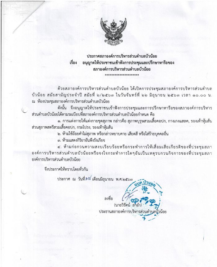 หัวข้อ :: อนุญาตให้ประชาชนเข้าฟังการประชุมและปรึกษาหารือของสภาองค์การบริหารส่วนตำบลบัวน้อย