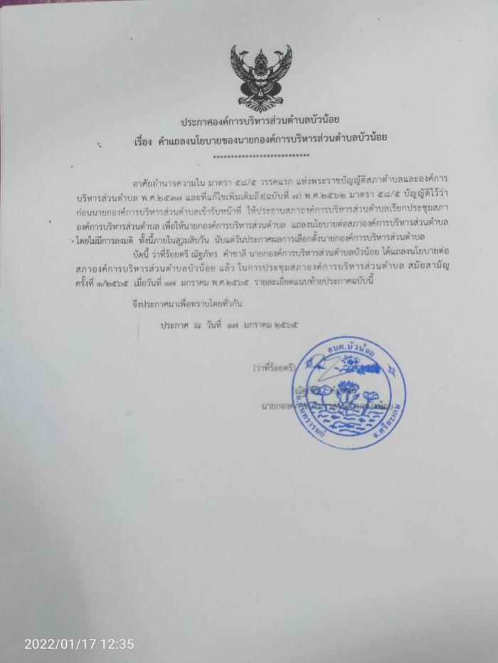 ประกาศองค์การบริหารส่วนตำบลบัวน้อย เรื่อง คำแถลงนโยบายของนายกองค์การบริหารส่วนตำบลบัวน้อย