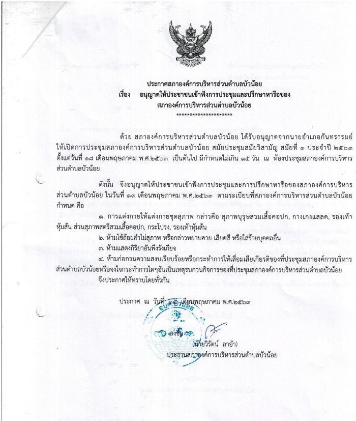 หัวข้อ :: อนุญาตให้ประชาชนเข้าฟังการประชุมและปรึกษาหารือของสภาองค์การบริหารส่วนตำบลบัวน้อย