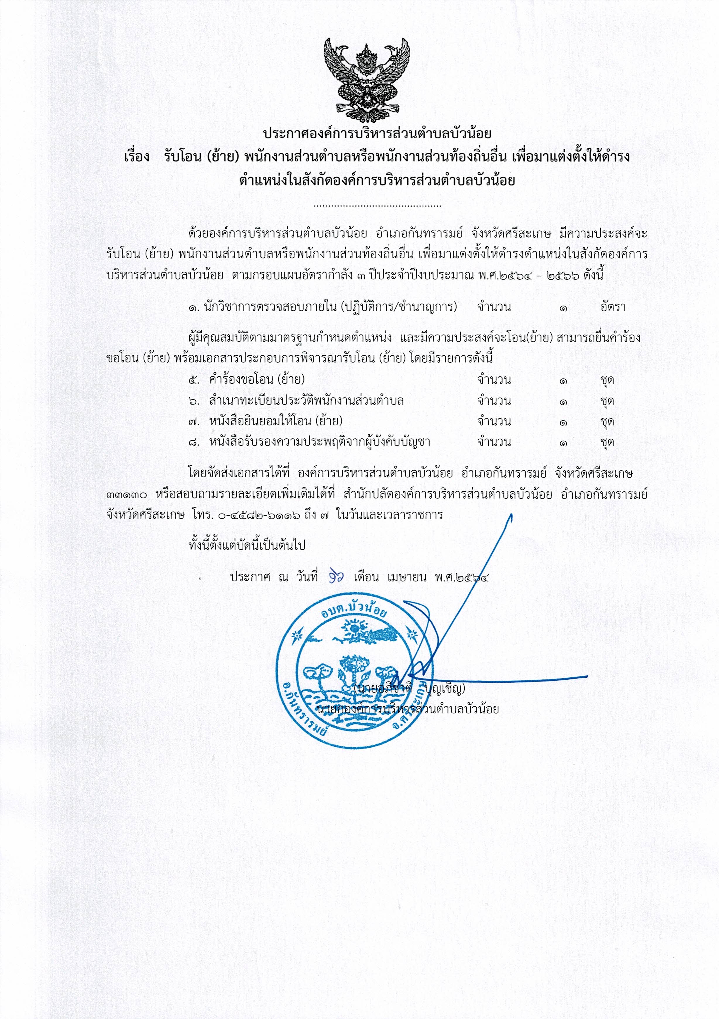 รับโอน(ย้าย)พนักงานส่วนตำบลหรือพนักงานส่วนท้องถิ่นอื่น เพื่อมาแต่งตั้งให้ดำรงตำแหน่งในสังกัดองค์การบริหารส่วนตำบลบัวน้อย