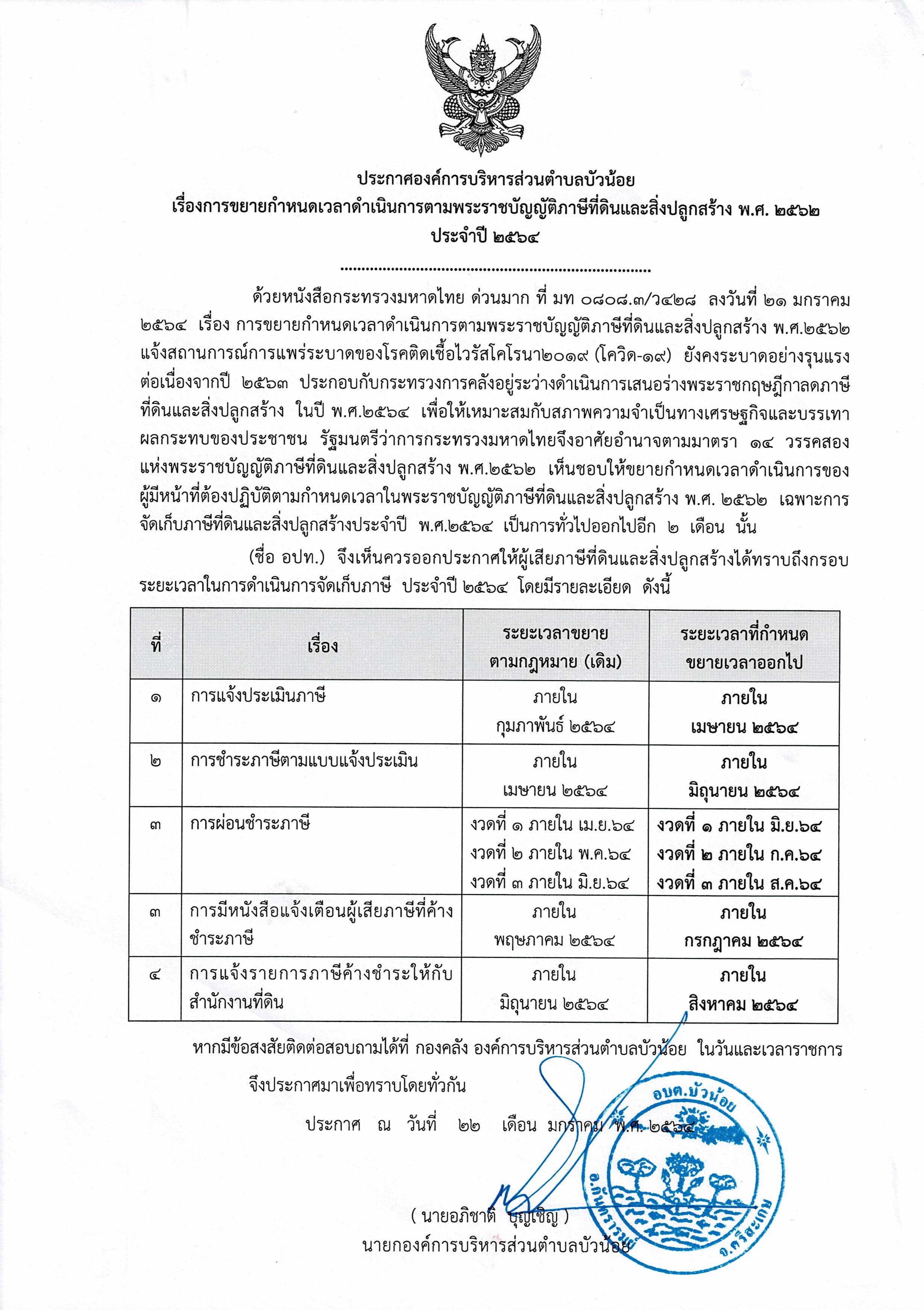 ประกาศองค์การบริหารส่วนตำบลบัวน้อย เรื่อง การขยายกำหนดเวลาดำเนินการตามพระราชบัญญัติภาษีที่ดินและสิ่งปลูกสร้าง พ.ศ.๒๕๖๒ ประจำปี ๒๕๖๔