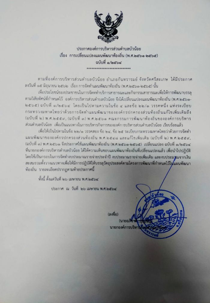หัวข้อ :: ประกาศ เรื่อง การเปลี่ยนแปลงแผนพัฒนาท้องถิ่น (พ.ศ.๒๕๖๑-๒๕๖๕) ฉบับที่ ๑/๒๕๖๔