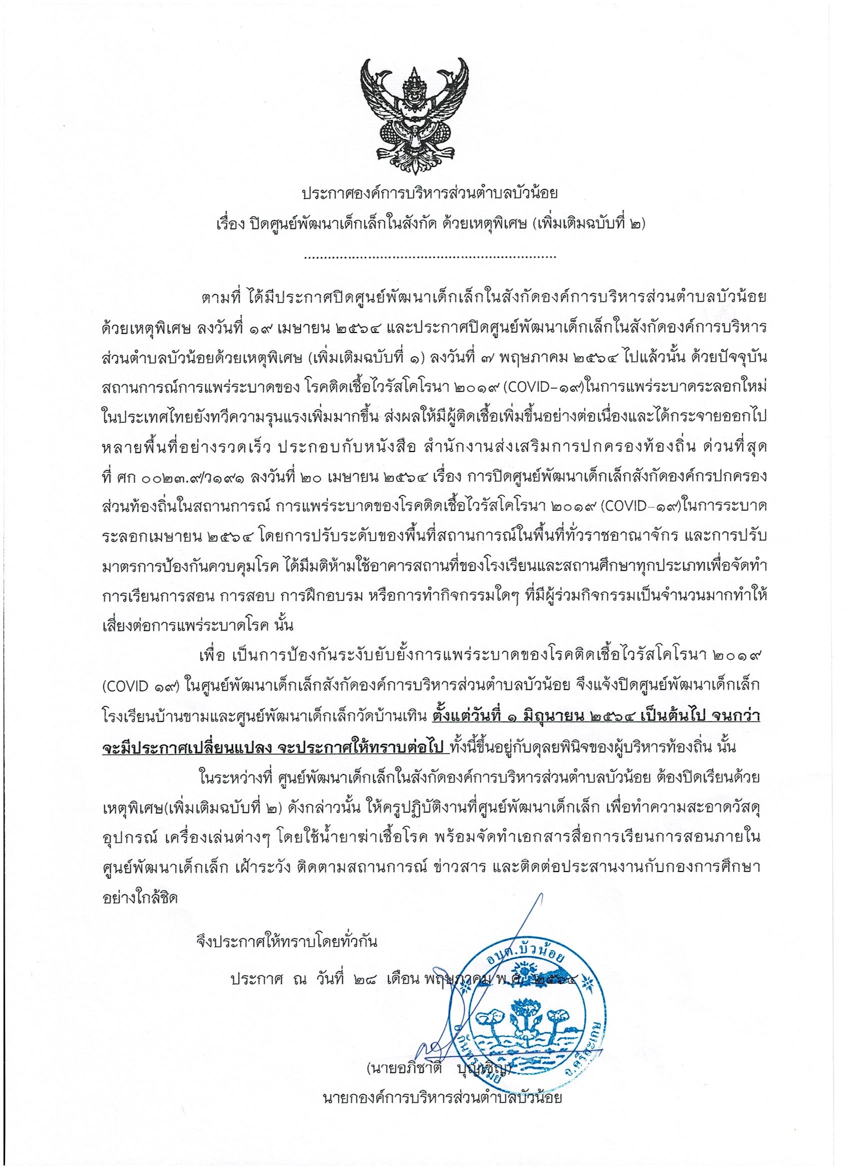 ประกาศองค์การบริหารส่วนตำบลบัวน้อย เรื่อง ปิดศูนย์พัฒนาเด็กเล็กในสังกัด ด้วยเหตุพิเศษ(เพิ่มเติมฉบับที่2)